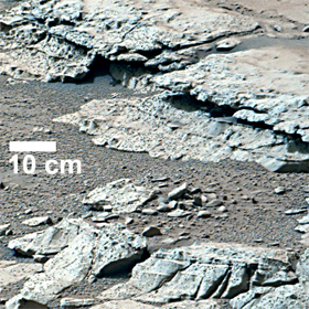 Third, shales are not restricted to the planet Earth. Several years ago evidence of layered rocks that show differential weathering of soft vs hard strata was discovered on Mars (Malin, M.C., and Edgett, K.S., 2000, Sedimentary rocks of early Mars, Science, v. 290, p. 1927-1937). Considering that much of the Martian sediments were derived from weathering of basalts, it is not a stretch to expect that the soft weathering intervals of Martian stratigraphy are clay dominated and consist of rocks that on Earth would be called mudstones. The 2004 MER rovers also brought us images of sediment layers that are so fine grained that they are probably mudstones, and images of flaky weathering sediments that on Earth would most likely be identified as a shale or shaley siltstone. Finally the latest rover to explore Mars, Mars Science Lab/Curiosity that touched down in August 2012, has located bona fide mudstones just 450 m distant from its landing site and is now en route to a location where we hope to find more mudstones and also sedimentary sulfate/evaporite deposits. At the moment the rover is traversing rough terrane to reach that locality, probably in the Fall of 2014.